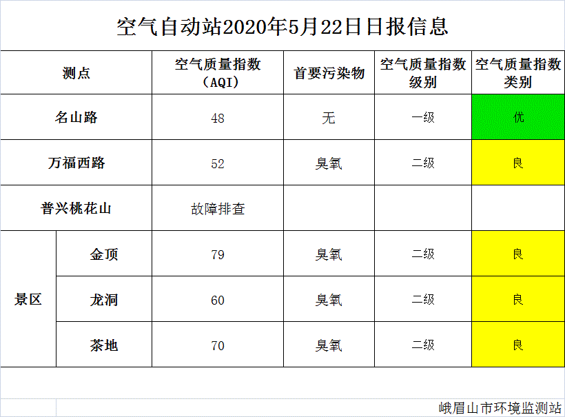 【峨眉山生态环境局】空气自动站2020年5月22日日报
