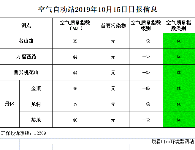 【峨眉山生态环境局】空气自动站2019年10月15日日报信息