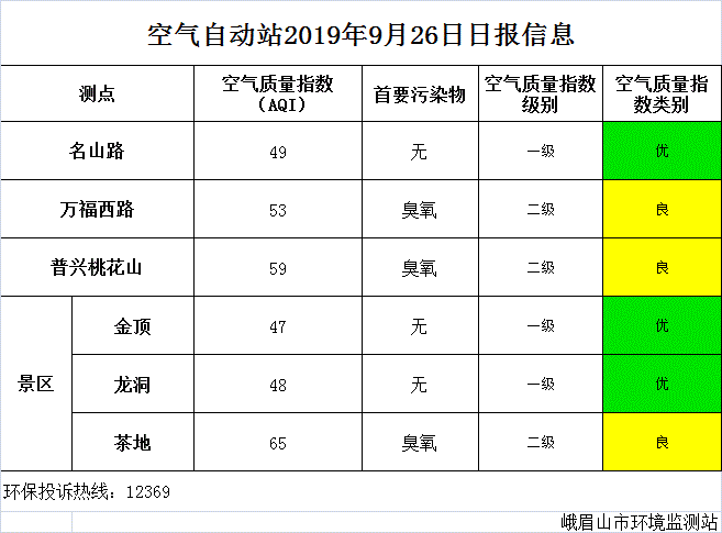 【峨眉山生态环境局】空气自动站2019年9月26日日报信息