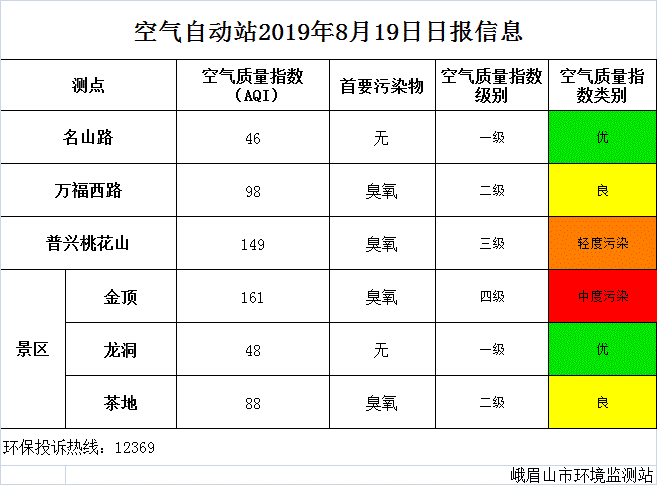 【峨眉山生态环境局】空气自动站2019年8月19日日报信息