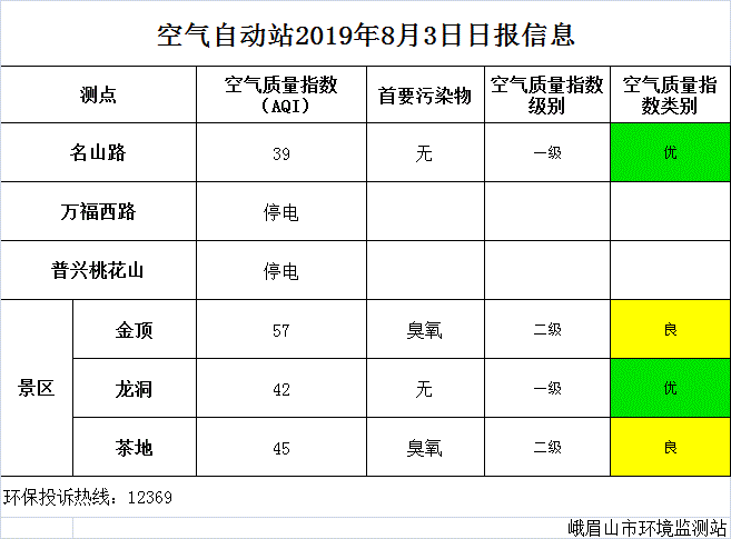【峨眉山生态环境局】空气自动站2019年8月3日日报信息