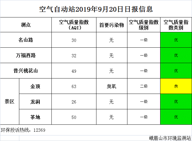 【峨眉山生态环境局】空气自动站2019年9月20日日报信息