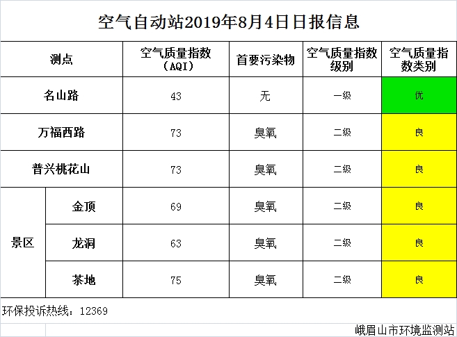 【峨眉山生态环境局】空气自动站2019年8月4日日报信息