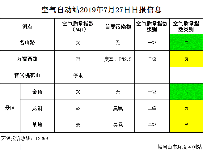 【峨眉山生态环境局】空气自动站2019年7月27日日报信息