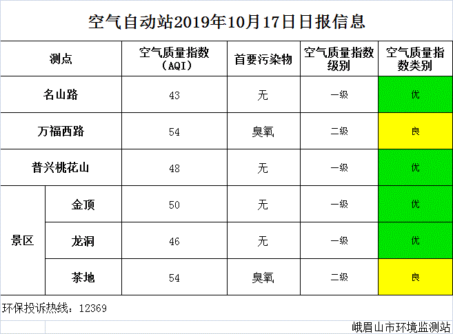 【峨眉山生态环境局】空气自动站2019年10月17日日报信息