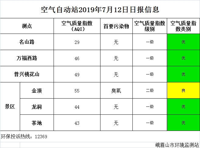 【峨眉山生态环境局】空气自动站2019年7月12日日报信息