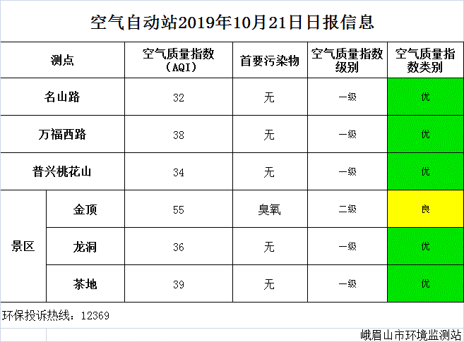 【峨眉山生态环境局】空气自动站2019年10月21日日报