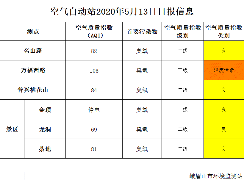 【峨眉山生态环境局】空气自动站2020年5月13日日报