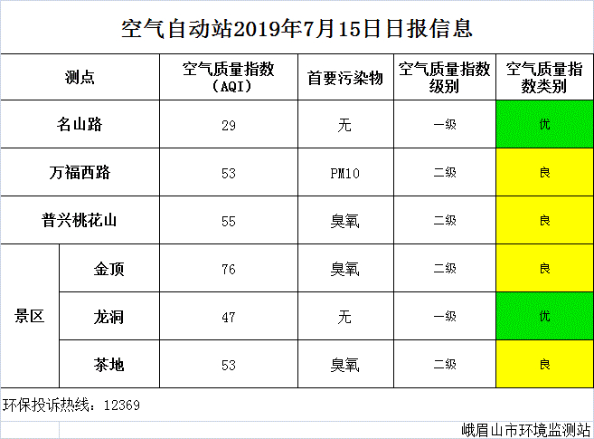 【峨眉山生态环境局】空气自动站2019年7月15日日报信息