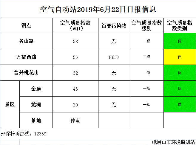 【峨眉山生态环境局】空气自动站2019年6月22日日报信息