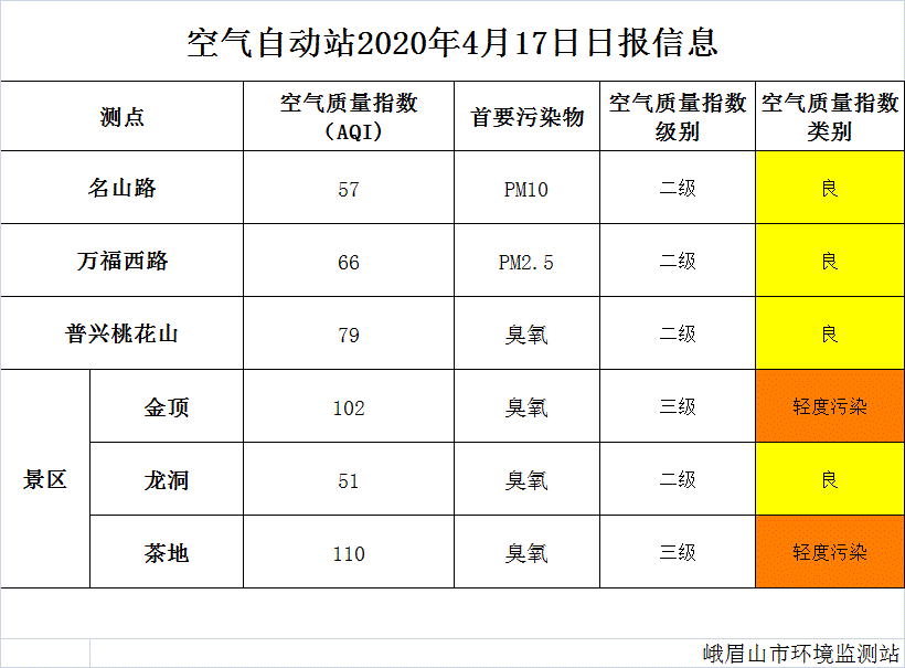 【峨眉山生态环境局】空气自动站2020年4月17日日报
