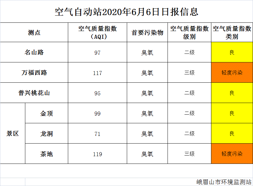 【峨眉山生态环境局】空气自动站2020年6月6日日报