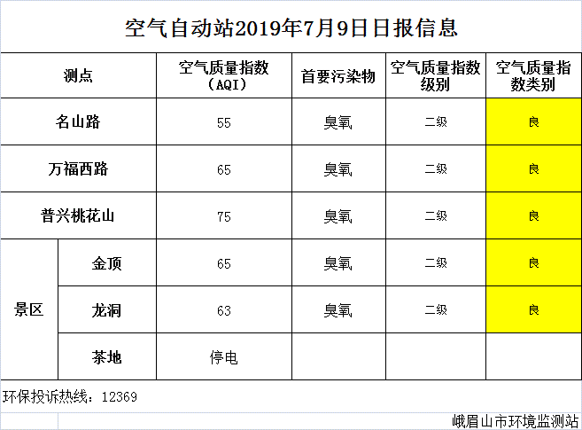 【峨眉山生态环境局】空气自动站2019年7月9日日报信息