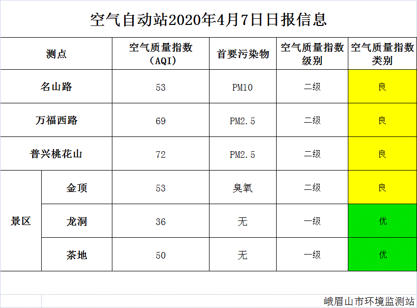 【峨眉山生态环境局】空气自动站2020年4月7日日报