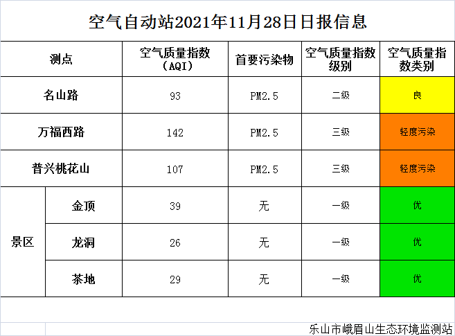 【乐山市峨眉山生态环境局】峨眉山市空气质量日报模式(11.21-11.28)