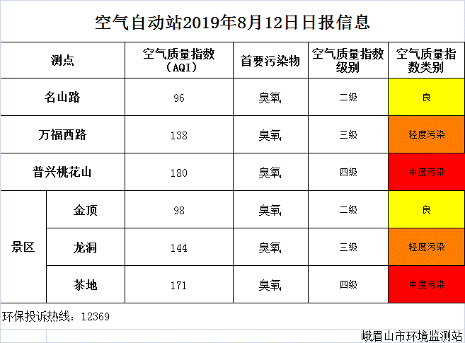 【峨眉山生态环境局】空气自动站2019年8月12日日报信息