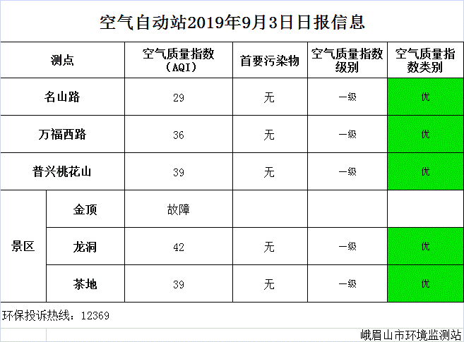 【峨眉山生态环境局】空气自动站2019年9月3日日报信息