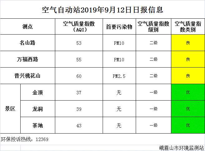 【峨眉山生态环境局】空气自动站2019年9月12日日报信息