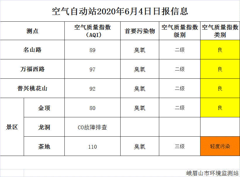 【峨眉山生态环境局】空气自动站2020年6月4日日报