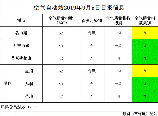 【峨眉山生态环境局】空气自动站2019年9月5日日报信息