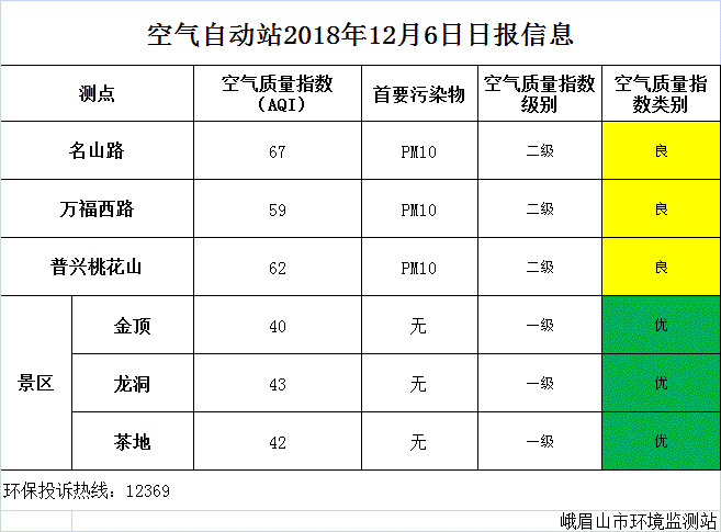 【市环保局】空气自动站2018年12月6日日报信息