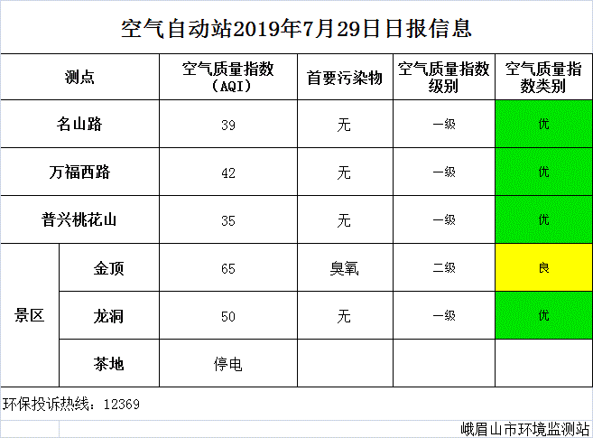 【峨眉山生态环境局】空气自动站2019年7月29日日报信息