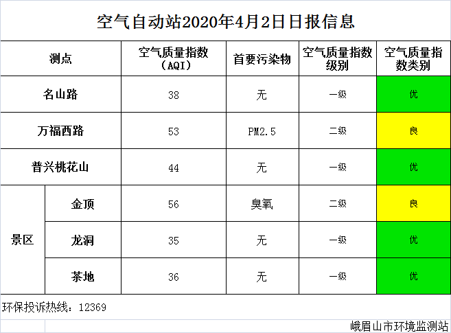 【峨眉山生态环境局】空气自动站2020年4月2日日报