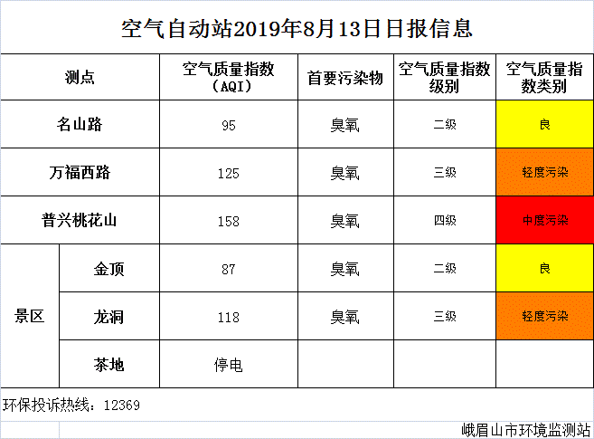 【峨眉山生态环境局】空气自动站2019年8月13日日报信息