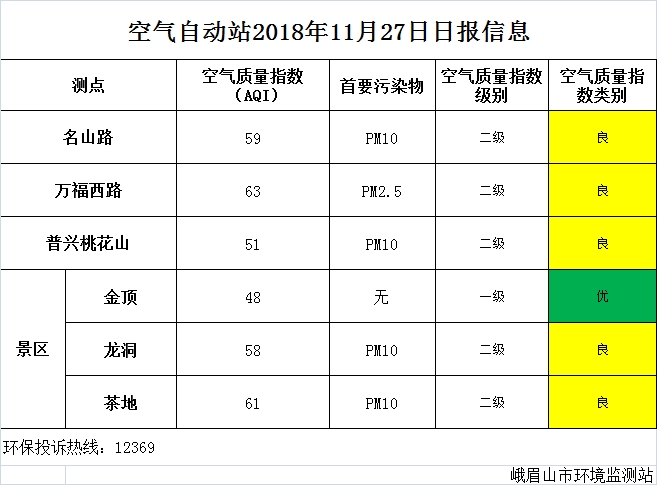 【市环保局】空气自动站2018年11月27日日报信息