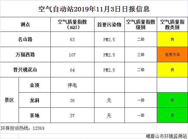 【峨眉山生态环境局】空气自动站2019年11月3日日报