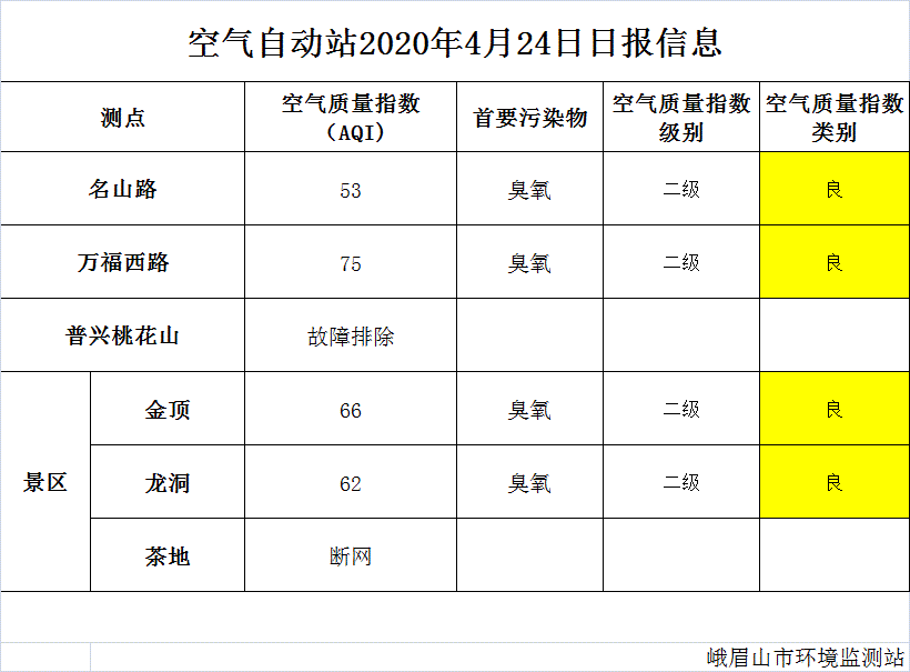 【峨眉山生态环境局】空气自动站2020年4月24日日报
