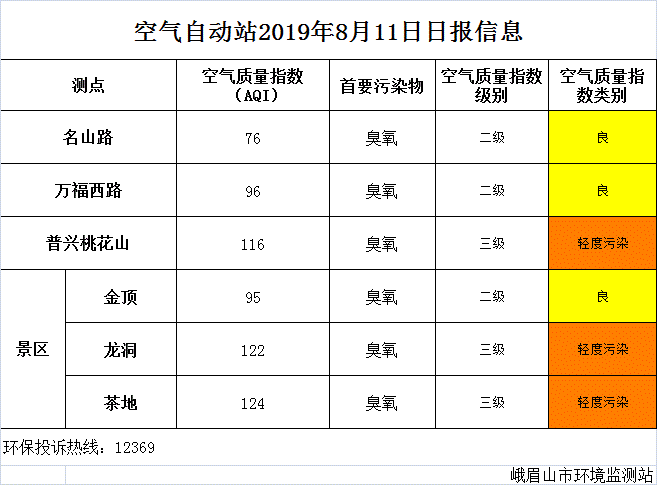 【峨眉山生态环境局】空气自动站2019年8月11日日报信息
