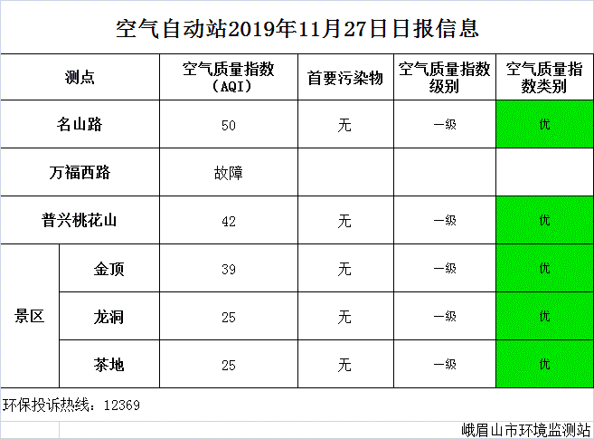 【峨眉山生态环境局】空气自动站2019年11月27日日报