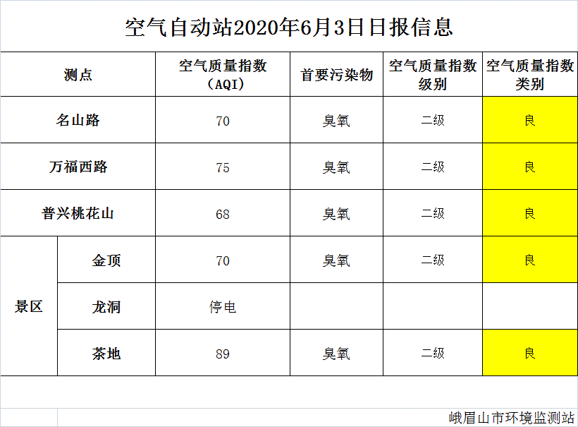 【峨眉山生态环境局】空气自动站2020年6月3日日报