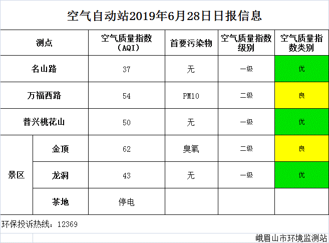 【峨眉山生态环境局】空气自动站2019年6月28日日报信息