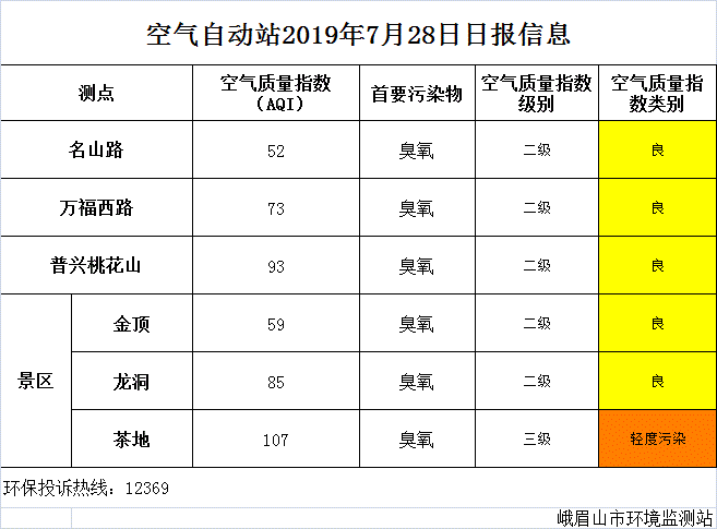 【峨眉山生态环境局】空气自动站2019年7月28日日报信息
