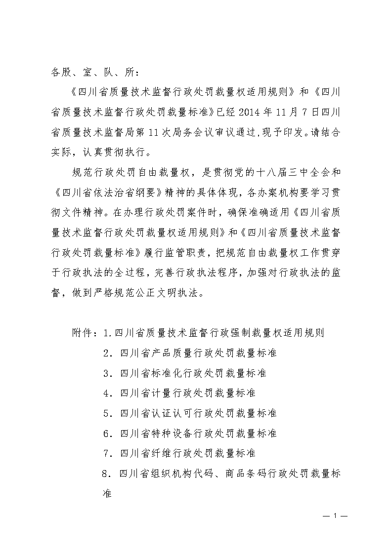 峨眉山市质量技术监督管理局关于转发《四川省质量技术监督行政处罚裁量权适用规则》和《四川省质量技术监督行政处罚裁量标准》的通知
