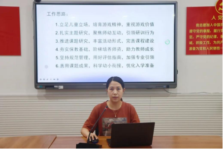 殷园长给到“六大工作思路”,做出专业引领。1.立足儿童立场,培育游戏精神。2.聚焦师幼互动,扎实主题研究。3.推进课题研究,完善课程建设。4.阶梯培养师资,助力教师成长。5.用好评估指南,坚持规范管理。6.善用课题成果,优化入学准备。