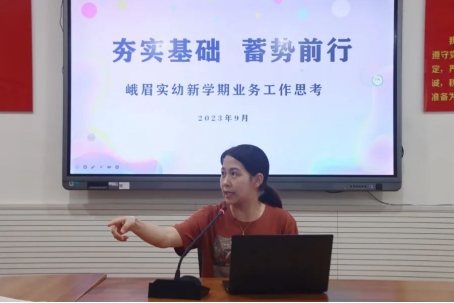 教师是学校教育发展的生命线,我园新鲜血液的不断注入,幼儿园需持续坚持夯实基础的园务工作思路,强师赋能,蓄势前行。9月11日,实幼开展新学期业务工作培训会,此次活动由业务园长殷晓红主讲,两园区全体教师参加培训。