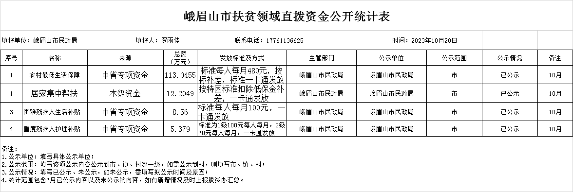 【市民政局】峨眉山市民政局2023年10月扶贫领域直拨资金公开统计表