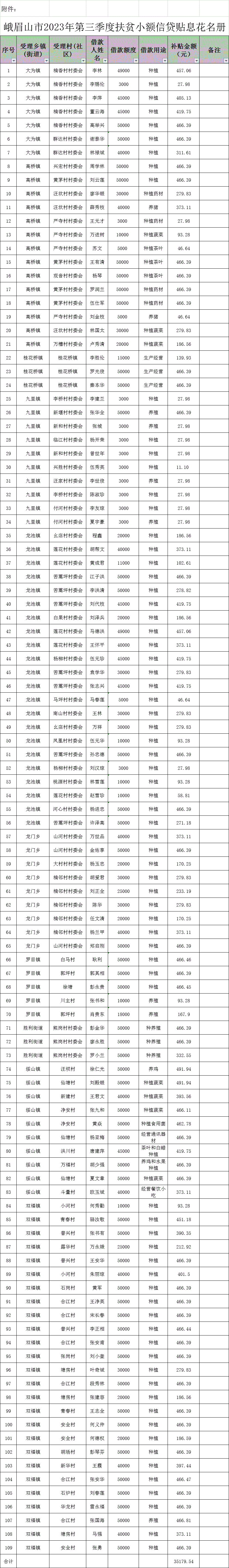 峨眉山市2023年第三季度脱贫人口小额信贷贴息支出财政衔接推进乡村振兴补助资金35179.54元,涉及109人次脱贫人口,现将贴息情况予以公示公告。