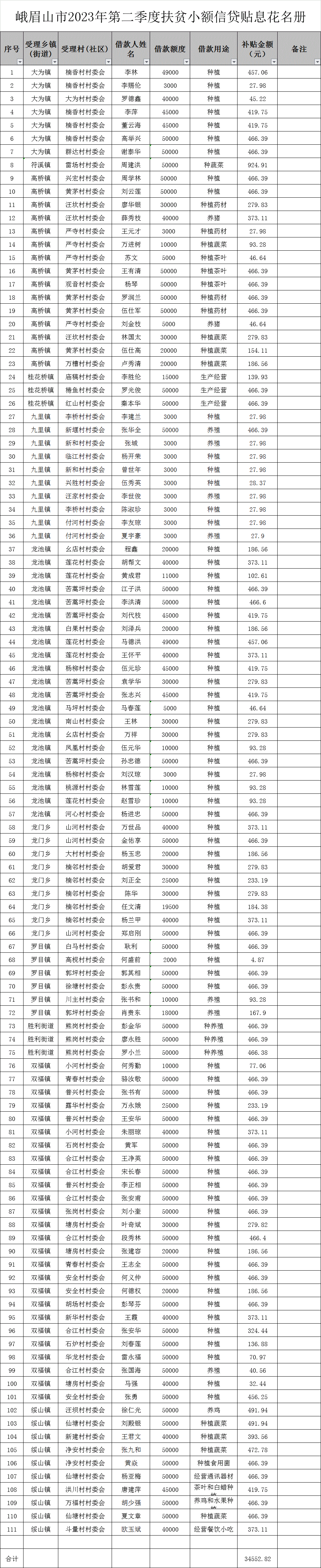 峨眉山市2023年第二季度脱贫人口小额信贷贴息支出财政衔接推进乡村振兴补助资金34552.82元,涉及111人次脱贫人口,现将贴息情况予以公示公告。