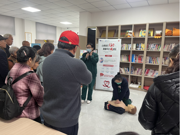 接着,医务志愿者们为大家现场演示了心肺复苏术的操作流程,详细讲解技术要领,并手把手指导现场居民心脏按压的部位、频率等,提高群众的自救互救能力。讲座结束后,医务人员为居民发放健康知识手册、进行免费提供健康检查并进行针对性健康指导,帮助居民更加科学理性的认识心梗,进一步扩大“心梗救治日”活动的影响力。