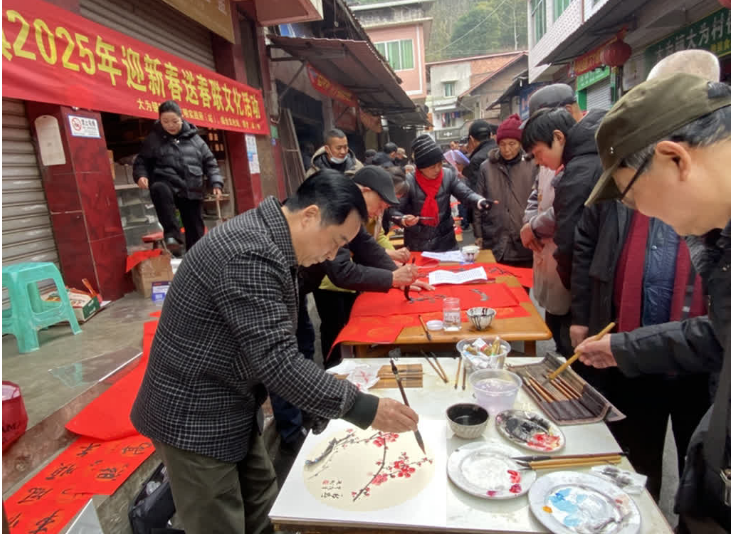 为营造喜庆祥和的新春节日氛围,1月18日,峨眉山市老协、大为镇新时代文明实践所(站)联合开展2025年“迎新年送春联”活动。来自市老年大学、峨眉山画院、民间文艺家协会、老年诗书画研究会、镇老(体)协等10余名书法爱好者和字画志愿者为大家书写赠送春联和年画。市老协会长万仕君到场观摩指导,并为大家书写春联。