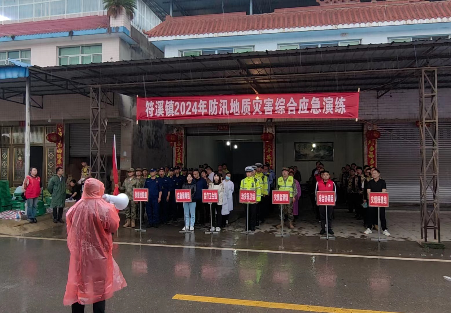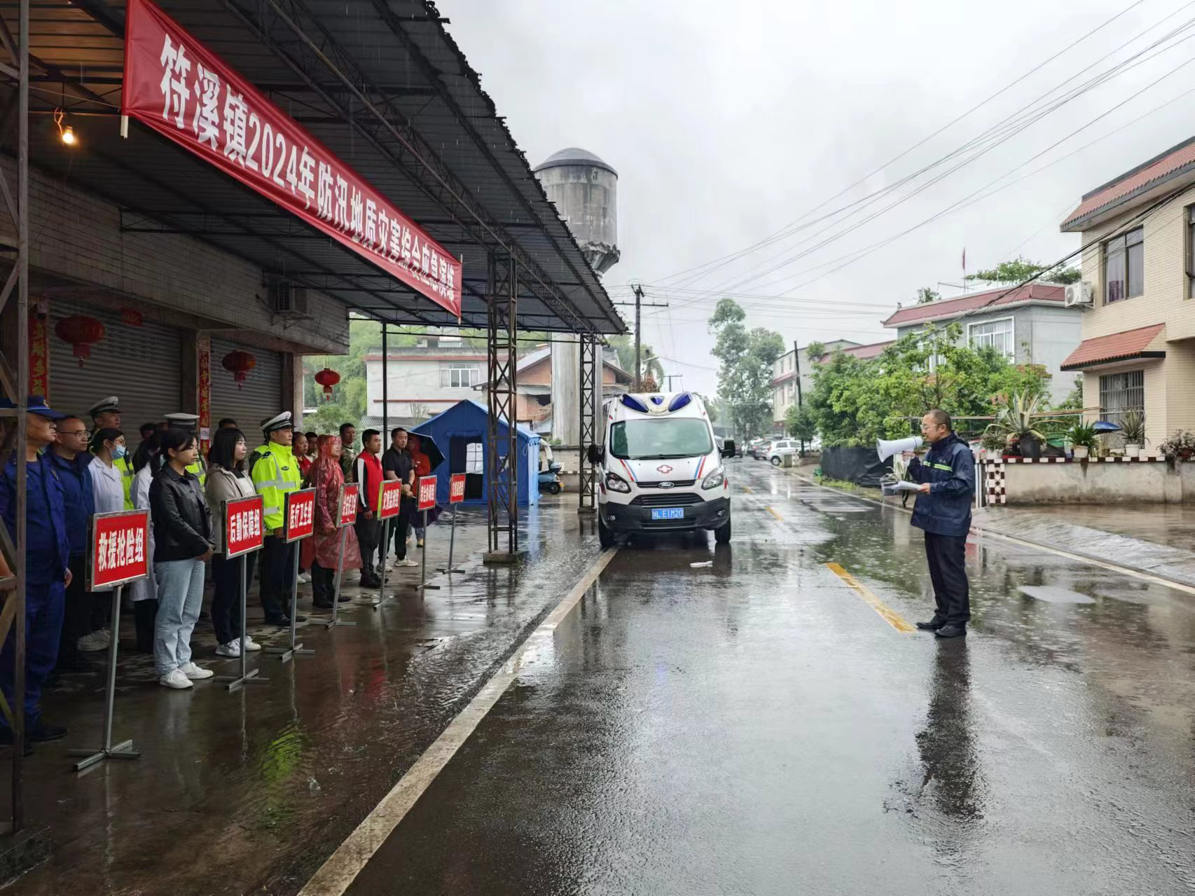 “经多日暴雨,今日巡查中发现上游水位快速上涨,情况紧急……”双福河边,战斗村11、12组水情监测员紧急汇报在巡查中发现的情况。这并非真实的“险情”,而是2024年5月8日符溪镇人民政府于战斗村11、12组洪水威胁区模拟开展防汛地质灾害综合应急演练一幕。