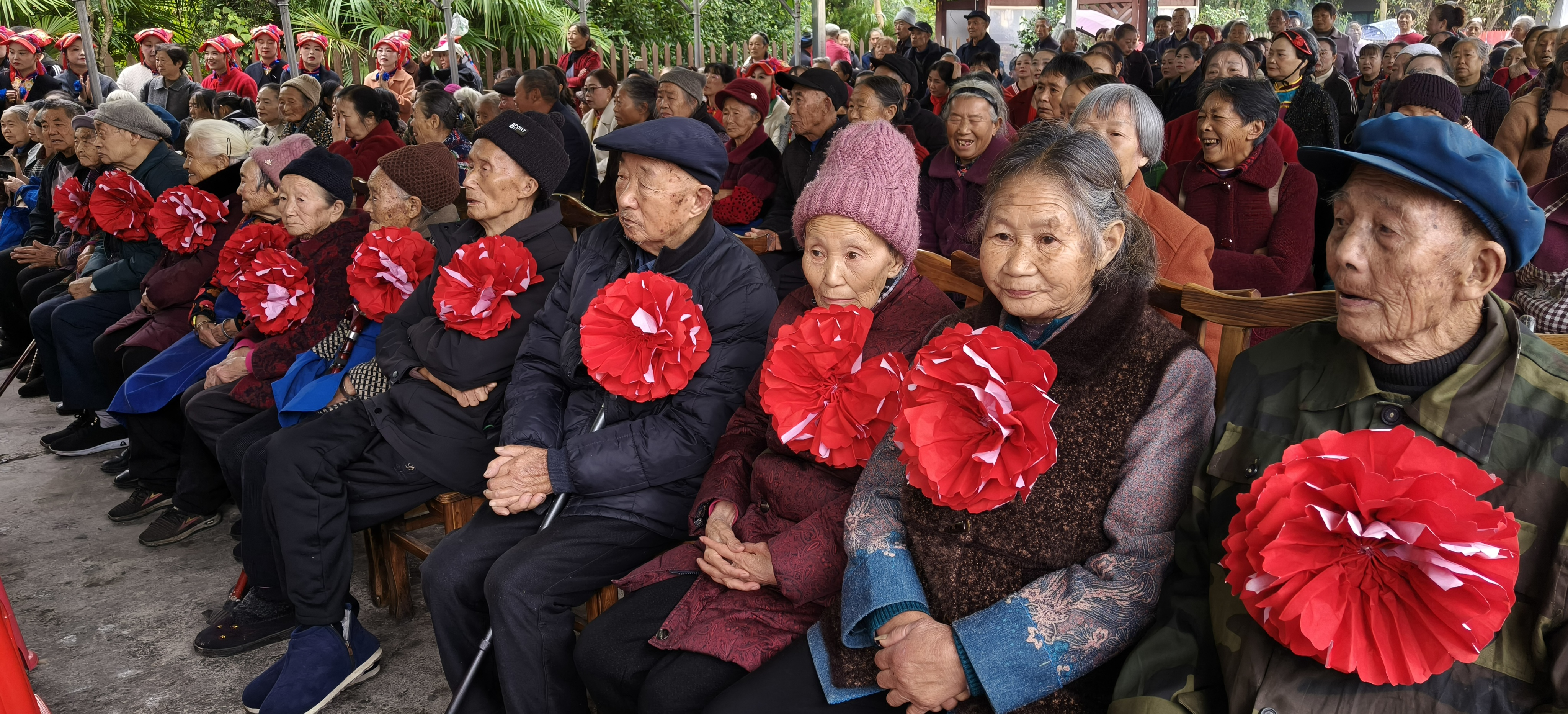 老人们欢聚一堂,三五好友共话家常,一边观看歌舞表演,一边想用美食。通过本次活动,不仅让老人们感受到了重阳节的欢乐氛围,向老人们传达集体的关心与敬爱,也通过村、社区举办的活动向辖区内的群众宣传孝老敬老的传统美德。