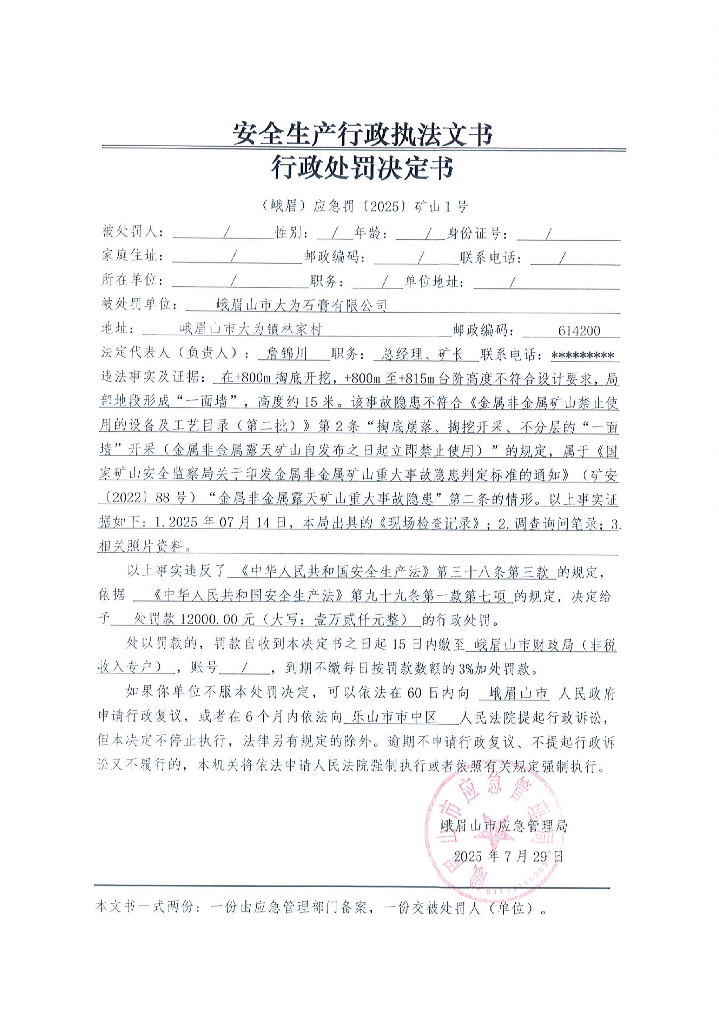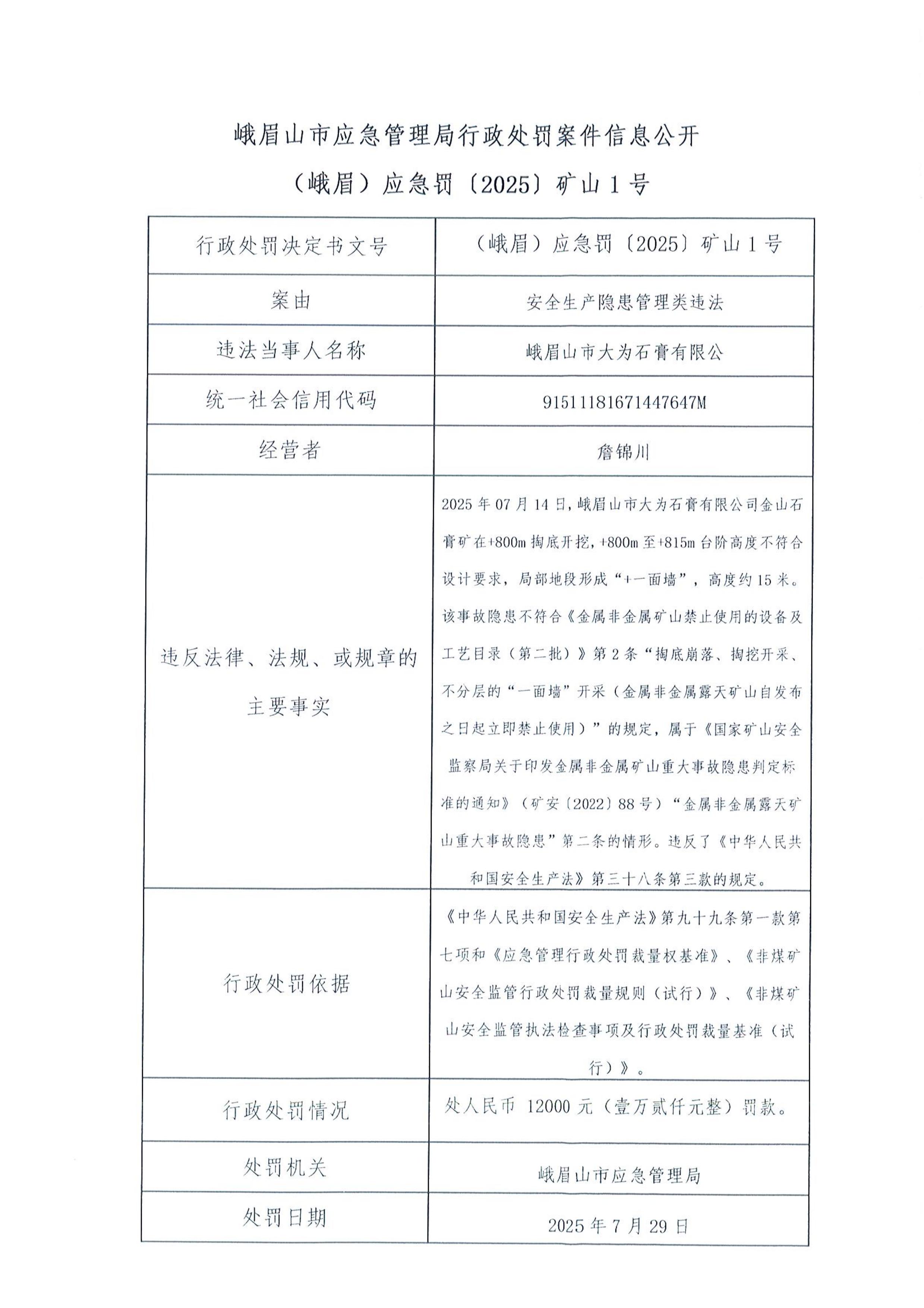 【市应急管理局】峨眉山市应急管理局关于对峨眉山市大为石膏有限公司行政处罚的公示